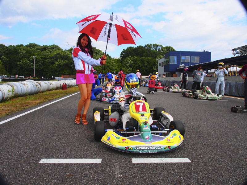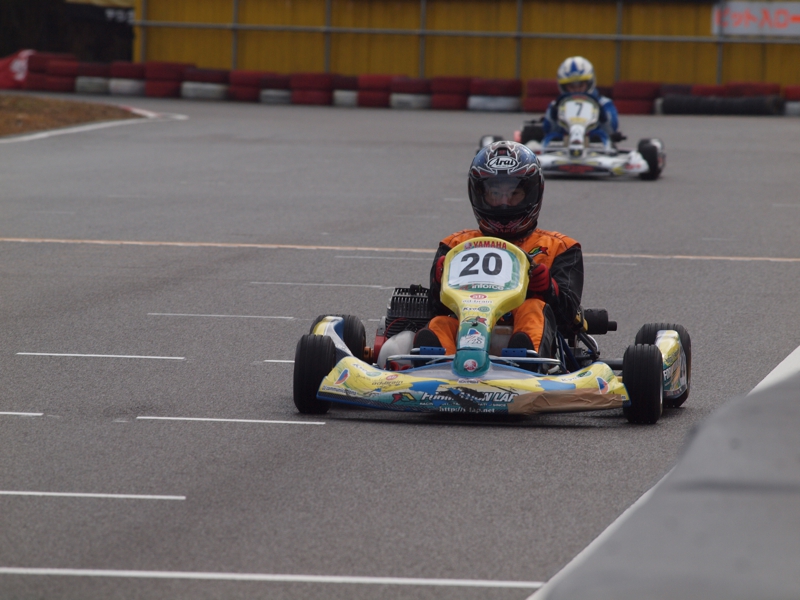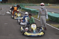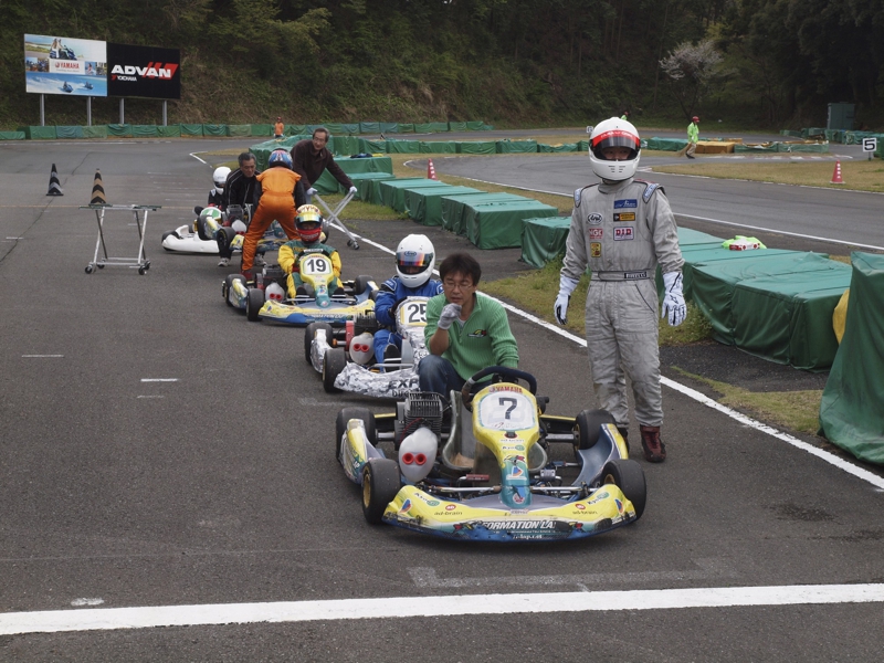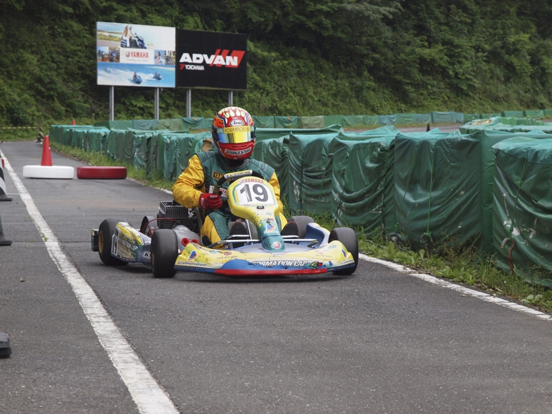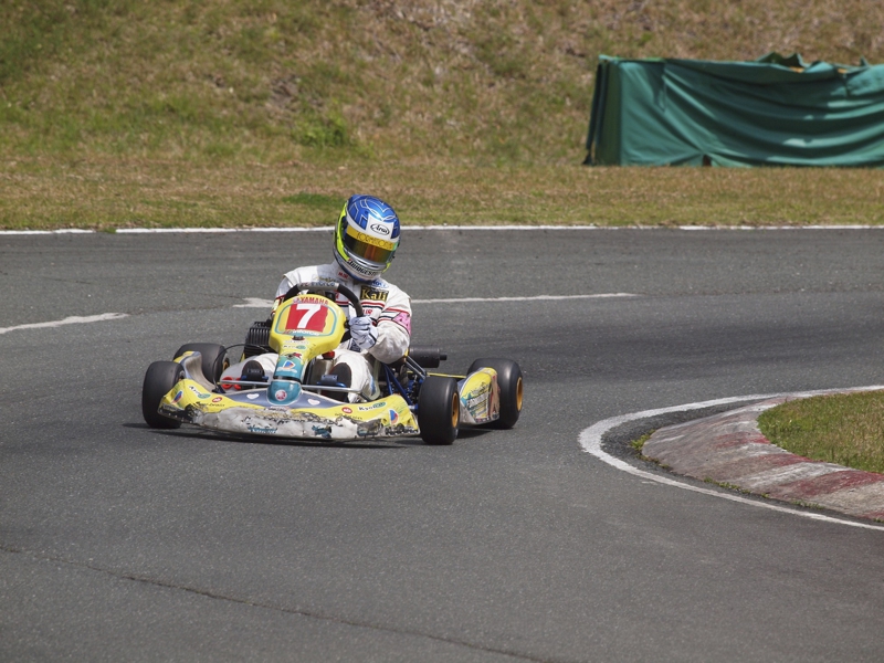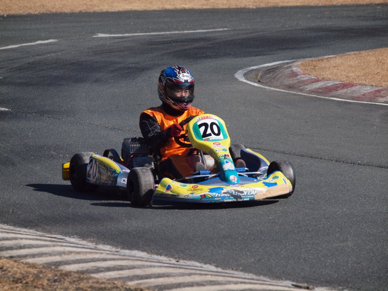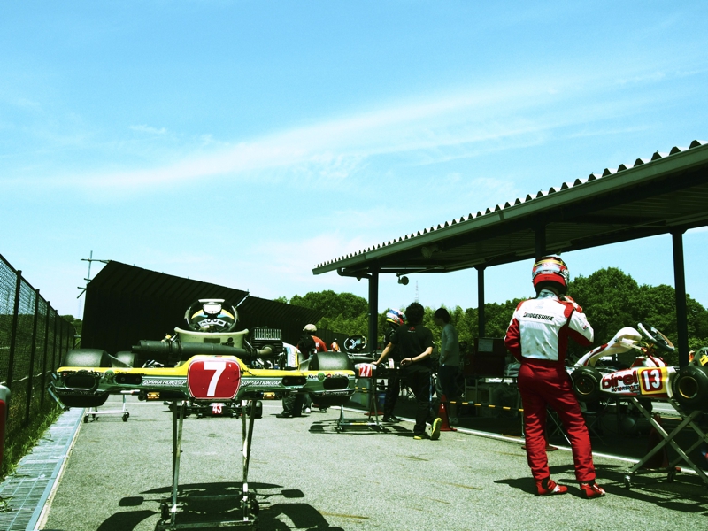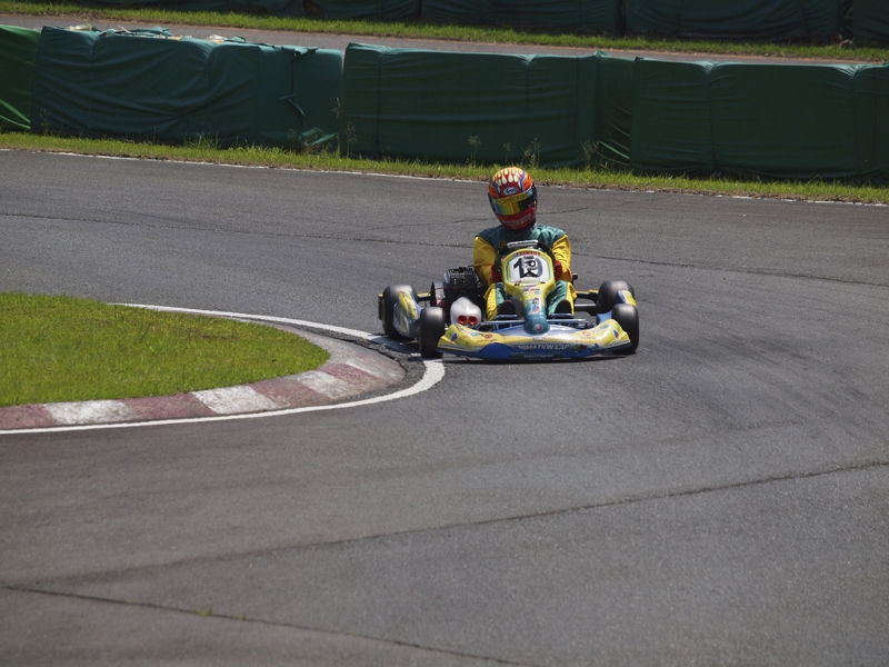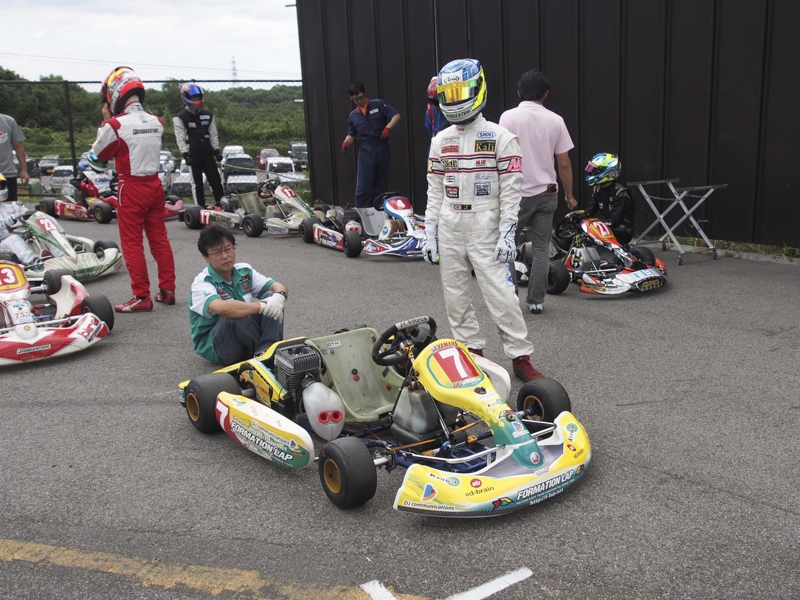 前戦、原因不明のE/G不調が1日続き、レースを失った塚本がRd.3に連続参戦した。まずは不調箇所の割り出しからと前日土曜の練習走行をスタートすると、前戦のままのくんだカートからはトラブルが出ず、全く原因不明のままレース当日を迎える事に。トラブルがなければそこそこの順位にいれるはずと挑んだ公式予選だったが、新品タイヤで前日のタイムを更新できず12番手と中断に埋もれる結果に。予選でもペースが上がらず12位でゴール。昨年の調子はどこへやら。マシンをみても変更したのは、オプションパーツのカーボンフロアパネルのみ。もしかしてと、ノーマルのアルミフロアパネルに交換して決勝をスタート。すると、スタートが決まっていきない9番手までジャンプアップ。しかし、離されははしないまでもやはりペースが上がらず、最終コーナでインを差されると連結列車のえじきになり、そのままアウトにはじき出され縁石の上で一回転。最後尾まで脱落し、後は追い上げるも15番手でゴール、タイムもトップの.5落ちとかなりの重傷。次戦はは苦手の真夏の8月開催。なんとか不調の波から脱したいところだ。