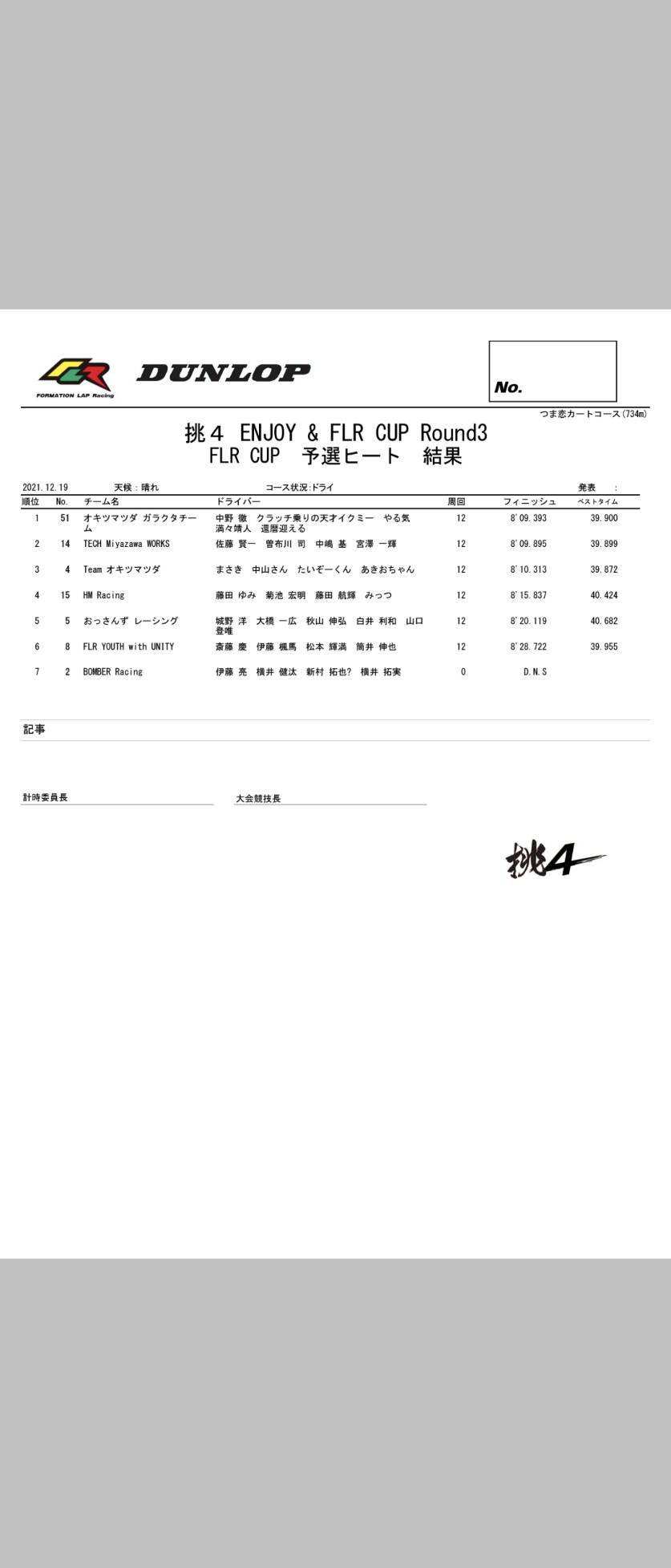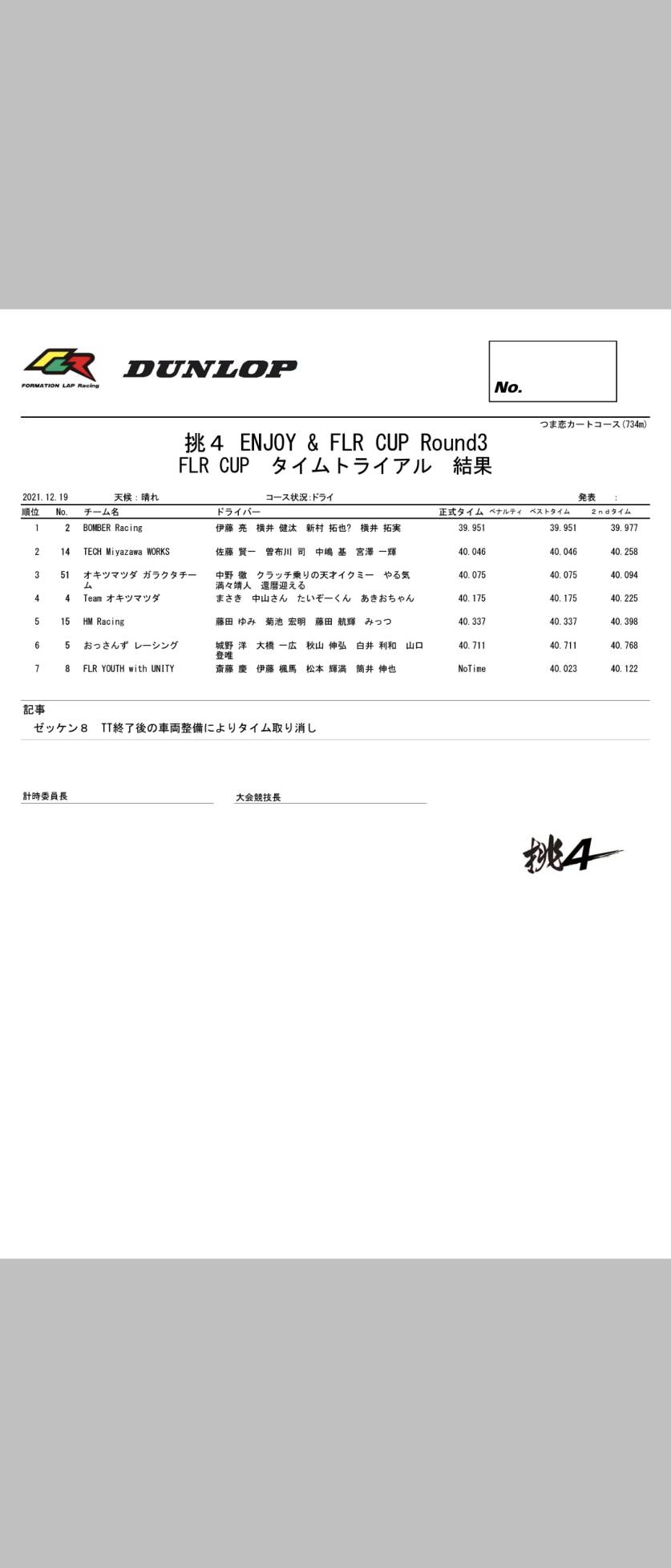 | 2 | BOMBER Racing | 伊藤 亮 | 横井 健汰 | 新村 拓也 | 横井 拓実 | - | - | - | |