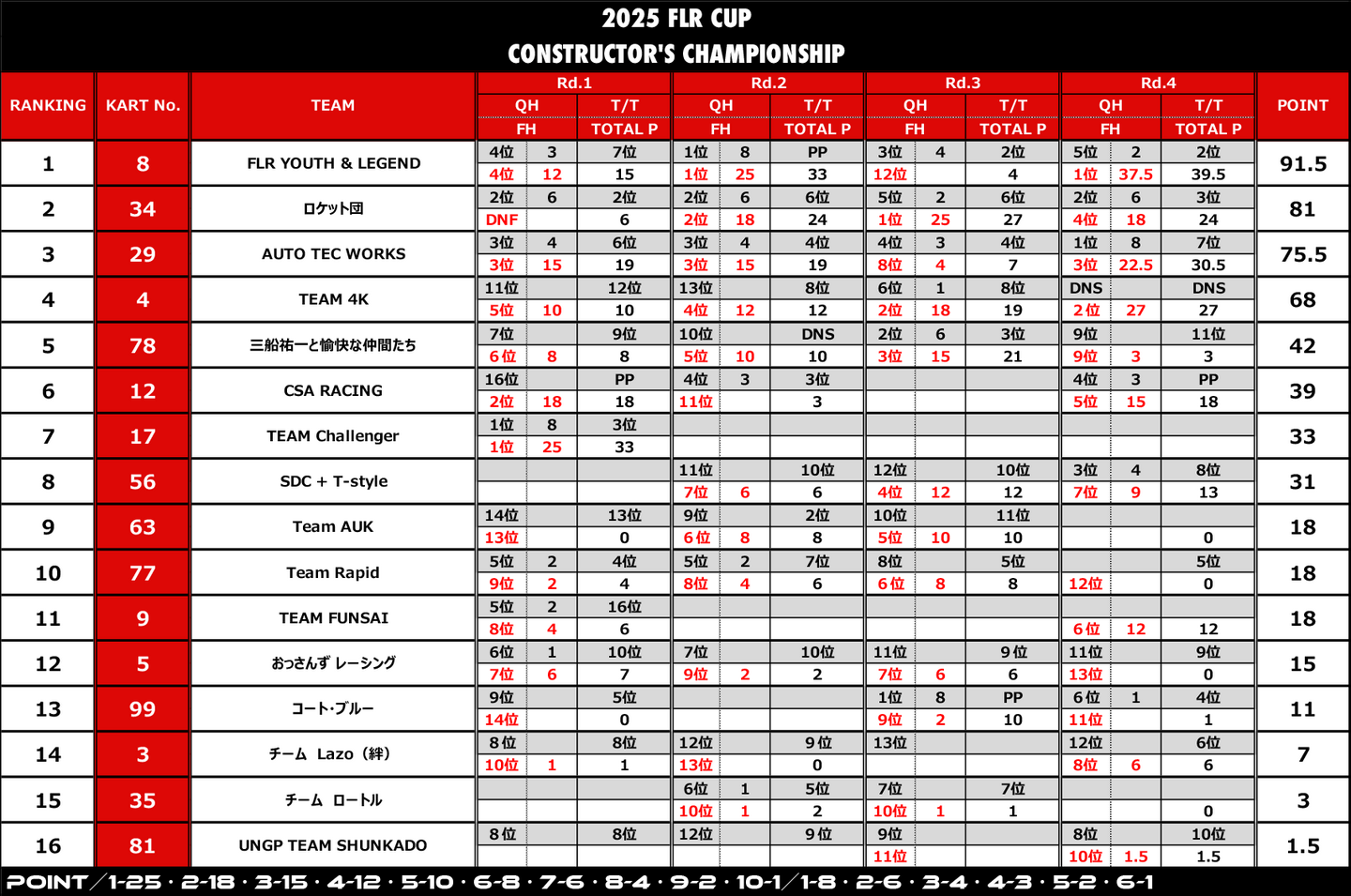 こうして2025シーズンも盛り上がりの中終宴を迎え、優勝したFLR YOUTH & LEGENDが逆転でシリーズチャンピオンを獲得し昨年に続き2連覇を達成。シリーズ2位には4位まで順位を挽回したロケット団がはいり、なんとかチェッカーを受けたAUTO-TECがシリーズ3位を獲得した。