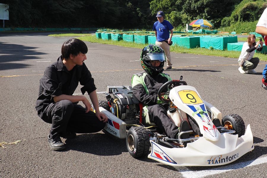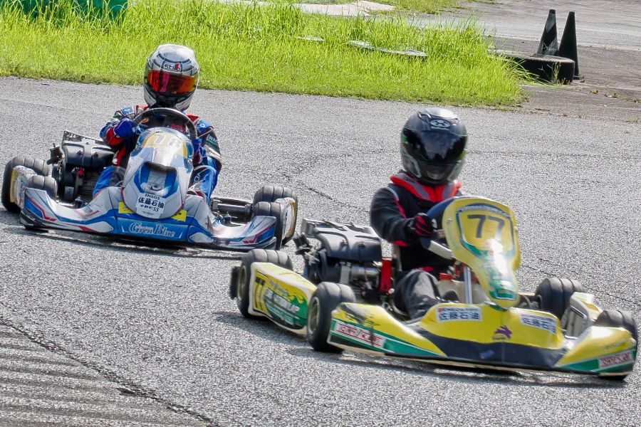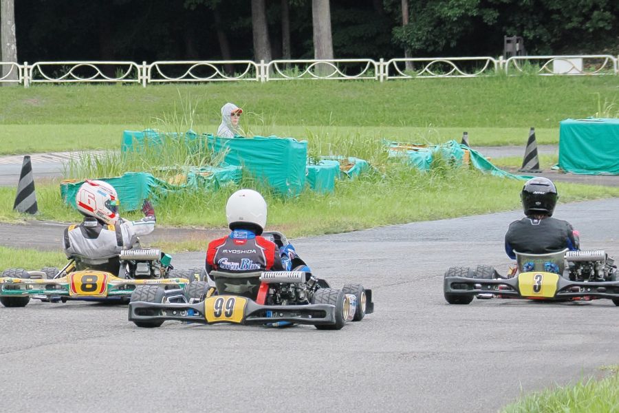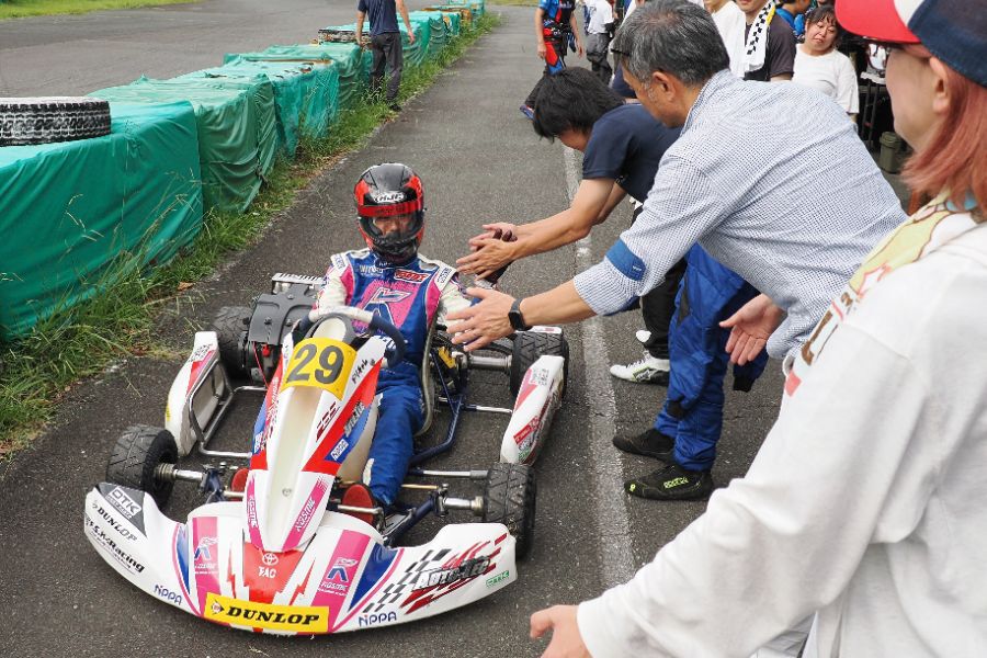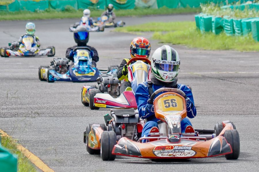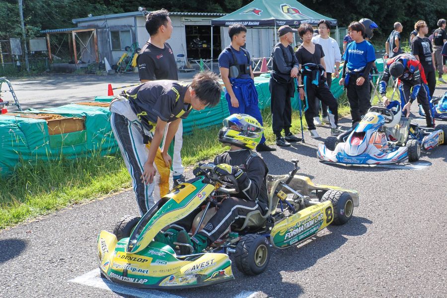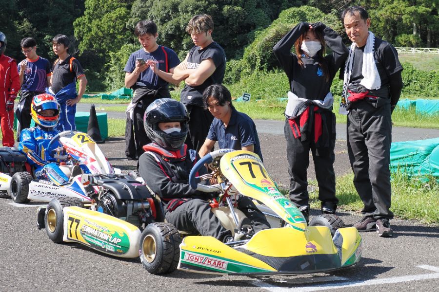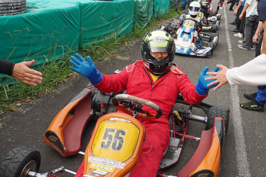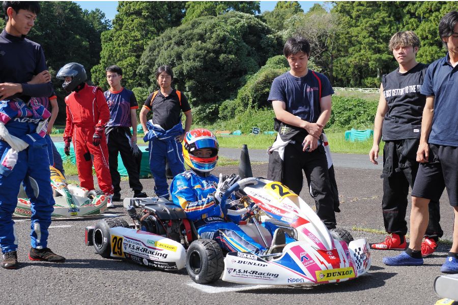 そして始まったスプリント予選。CSA小山田、ロケット団中野、FLR YOUTH琉惟の順でファーストコーナーへなだれ込む。スタートでポジションを1つ落とした琉惟だったが、4周目には中野を捉えトップの小山田に標準を定める。中野とのバトルで1つ抜け出し単独走行の小山田に、ペースで上回る琉惟が6周目にはぴったり後ろに張り付くと、7周目の3コーナーで見事にパッシングをきめトップに躍り出る。中野もトップ2台のバトルに乗じ小山田をパスし2位に上がる。4位以下を2秒以上離したトップ3だったがここからバトルはますます激しくなり、後続も追いつき7台パックの大バトルに。4コーナーで中野が強引に琉惟のインを突くと行き場を失いコースアウト寸前に。迫っていた後続に次々と抜かれ5位まで後退。中野は最終ラップに2位までポジションを戻すも、AUTO TEC稲寄がトップでゴールし、CSA小山田、FLR琉惟は4,5位で予選を終えた。